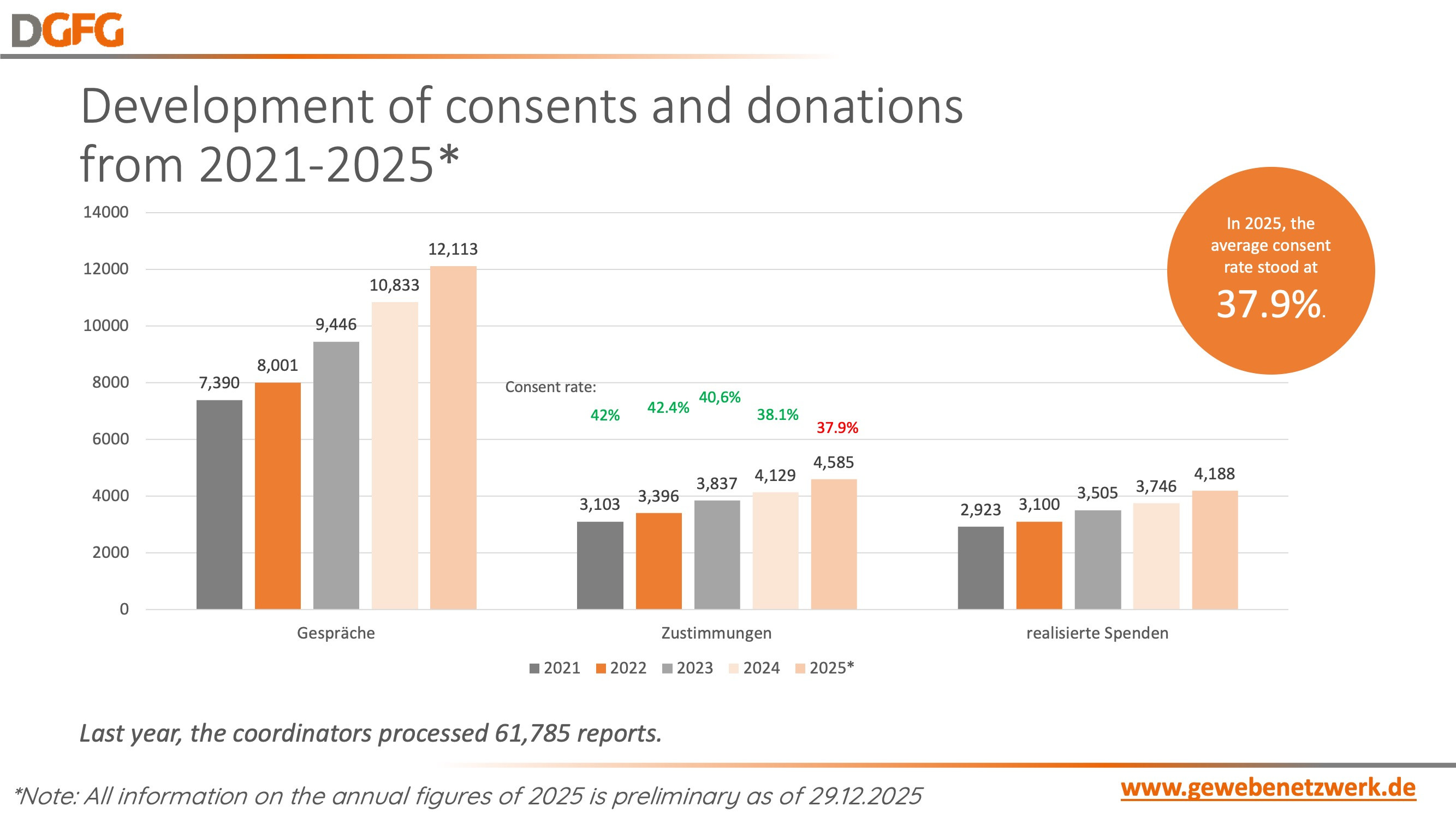 For the first time, the DGFG received over 60,000 reports of potential tissue donors from more than 320 institutions. In 2025, over 12,000 next-of-kin interviews about tissue donation were conducted, resulting in 4,585 cases of consent for donation. At 37.9%, the consent rate was only slightly below that of the previous year, and followed a downward trend of 0.2% over the past three years.