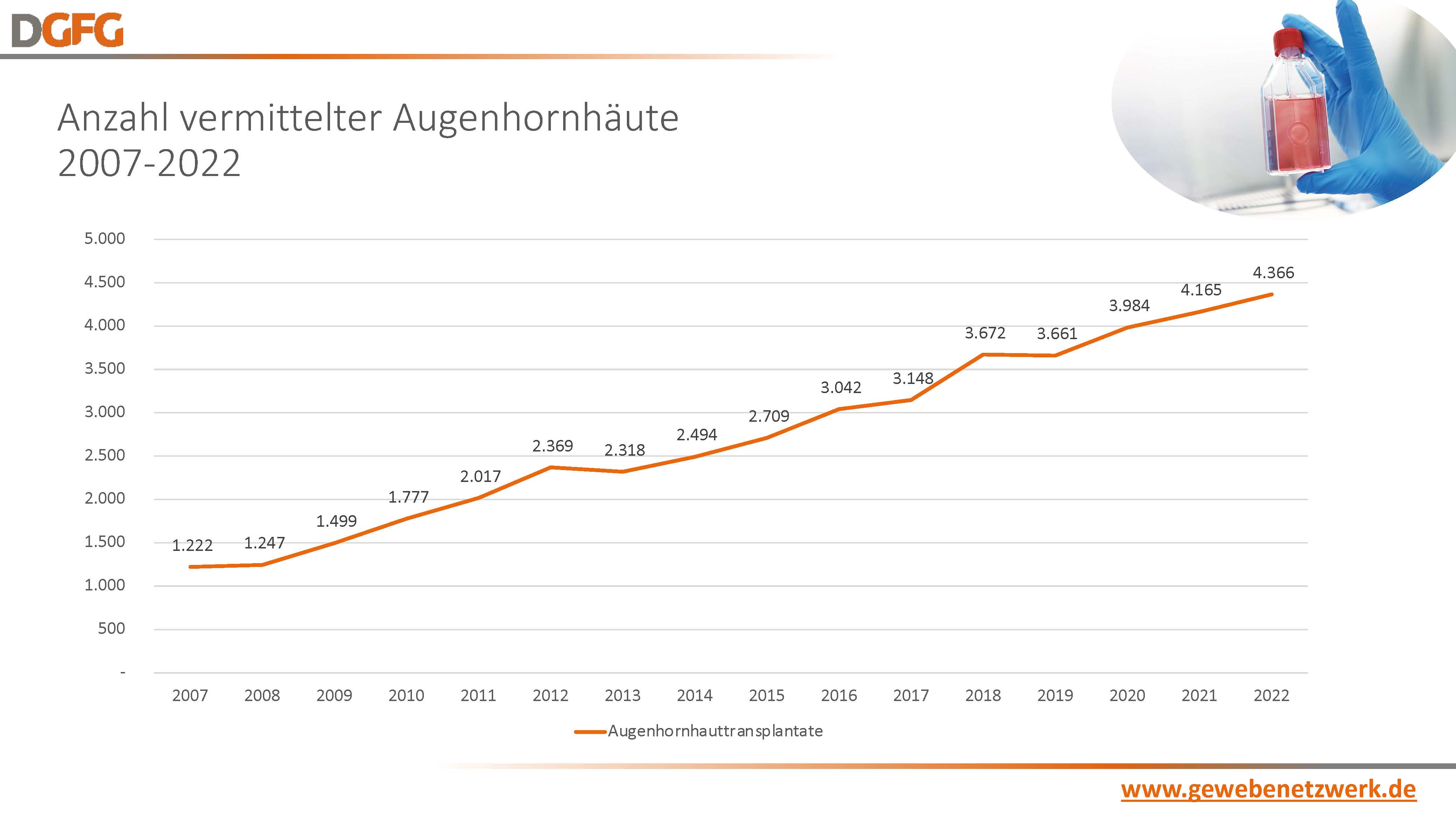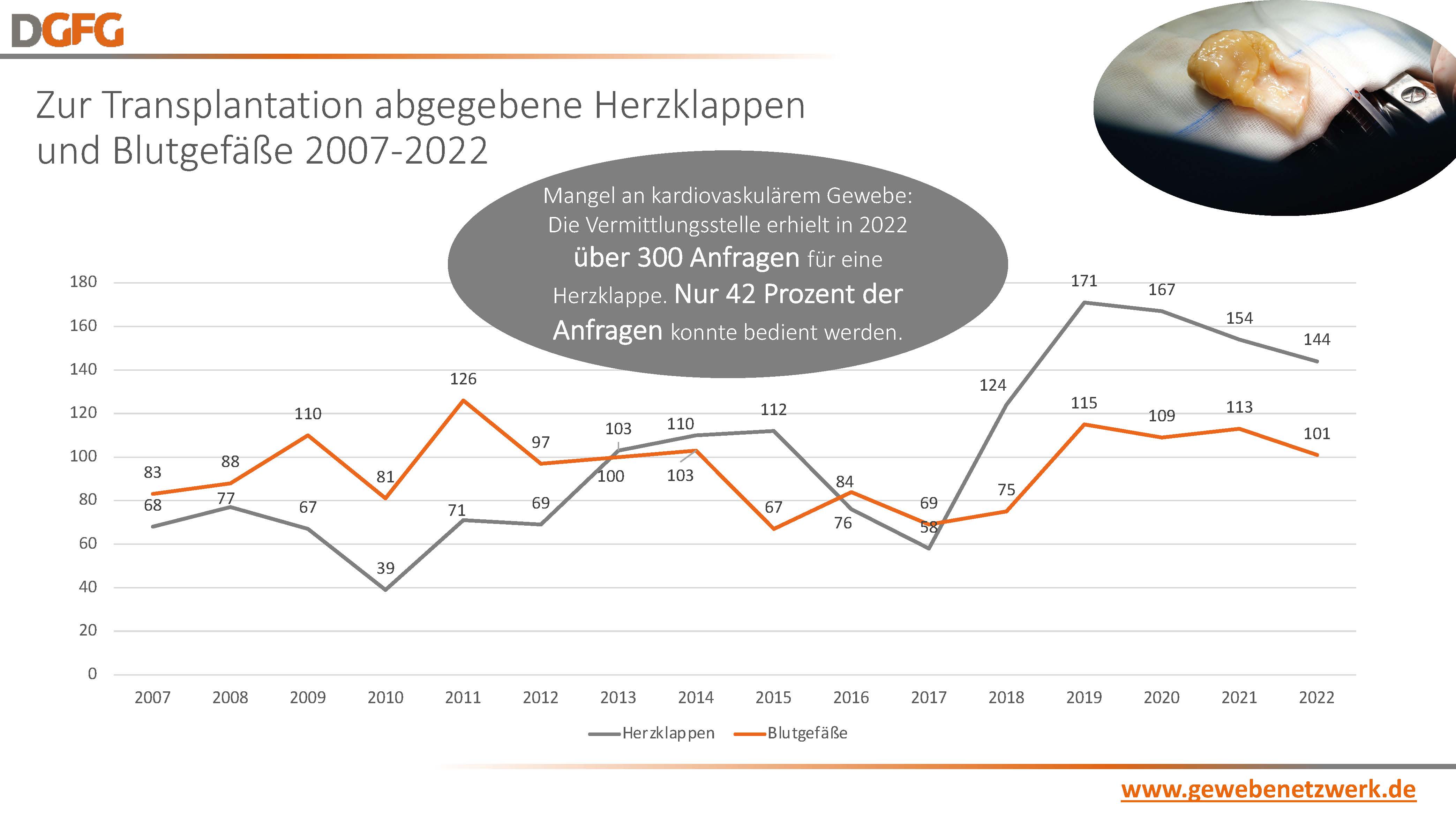 Hannover, 01.01.2023 – 3.070 Menschen spendeten in 2022 Gewebe – ein neuer Rekord. Im Vergleich zum Vorjahr konnte die Deutsche Gesellschaft für Gewebetransplantation (DGFG) die Gewebespende erneut steigern: 53 Gewebespendekoordinator:innen bearbeiteten knapp 45.000 Spendermeldungen, führten 7.915 Aufklärungsgespräche und erhielten 3.367 Zustimmungen. 42,5 Prozent aller Spender:innen und Angehörigen stimmten einer Gewebespende zu. Spendenstärkstes Bundesland in 2022 ist mit 448 Gewebespenden Nordrhein-Westfalen, dicht gefolgt von Sachsen mit 446 Gewebespenden. Insgesamt erhielten 7.111 Patient:innen ein Gewebetransplantat aus dem Netzwerk der DGFG. Trotz dieser erfreulichen Entwicklung blickt die DGFG besorgt in die Zukunft. Denn was fehlt sind lebensrettende Herzklappen. Während die DGFG die Spende von Augenhornhäuten ausbauen konnte, musste die gemeinnützige Gesellschaft einen starken Rückgang in der Spende von Herzklappen hinnehmen. Grund dafür ist insbesondere der Rückgang in der Organspende, aus der noch immer der Großteil an Herzklappen gewonnen wird. Zusätzlich gefährdet das im März 2022 in Kraft getretene Gesetz zur Stärkung der Entscheidungsbereitschaft bei der Organspende die Patientenversorgung erheblich. Die darin festgeschriebenen Zugriffsbeschränkungen[1] auf das geplante Register werden den Spendeprozess behindern und zu einem erheblichen Einbruch der Spendezahlen führen, sollte bis zum Registerstart an der Gesetzesreform nichts mehr geändert werden.